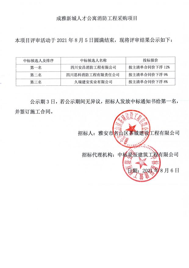 成雅新城人才公寓消防工程采購(gòu)項(xiàng)目中標(biāo)公示